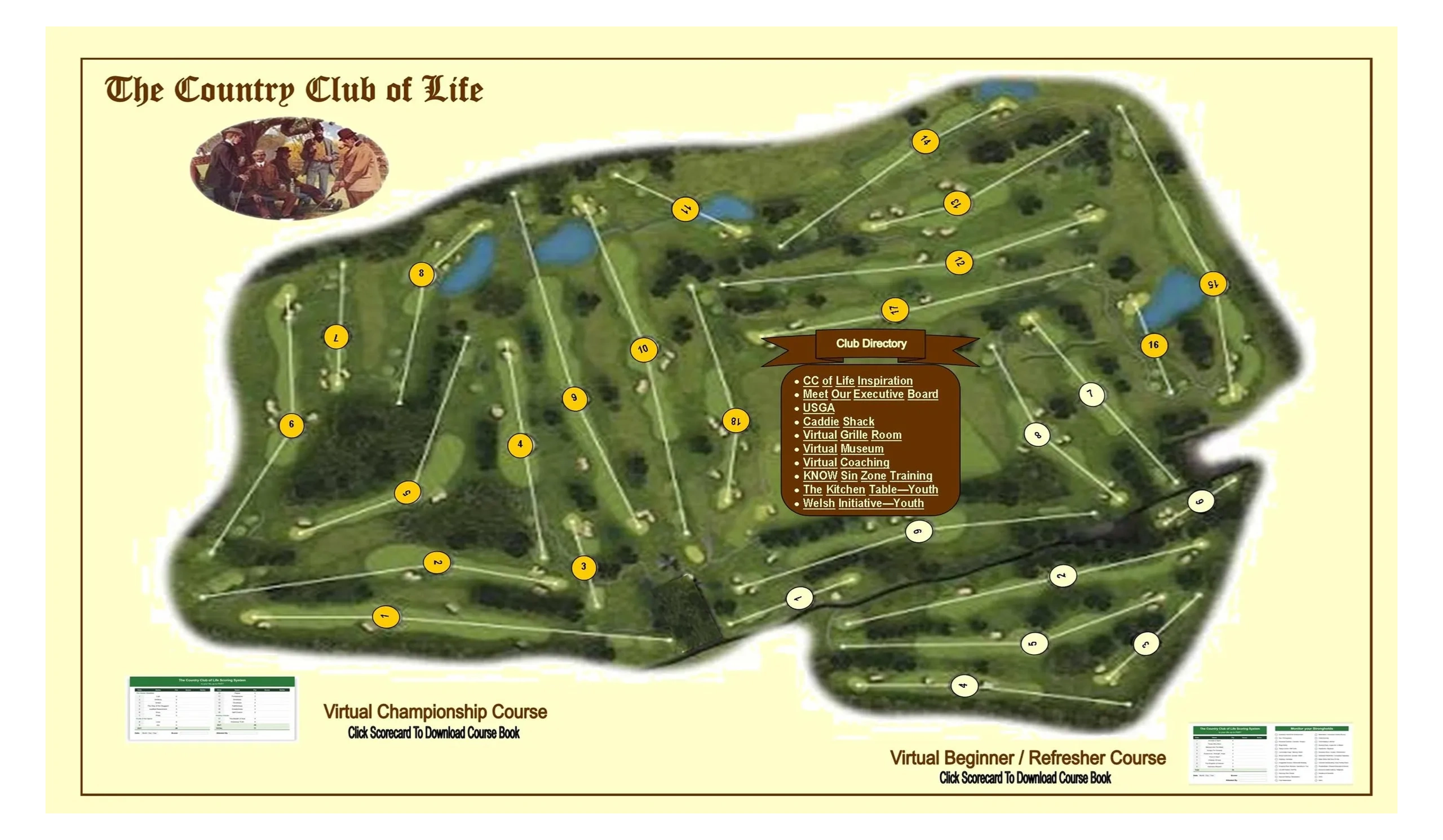 The CC of Life is composed of 2 virtual courses, a "Beginner/Refresher" and a "Championship." The "Beginner/ Refresher" is made up of 9 holes, and the "Championship" is 18 challenging holes, both designed as roadmaps for staying on par playing the game of life. Caddies (accountability relationships) are a must. These layouts are far too demanding, and their design deceptions are far too daunting to tackle without the assistance of local knowledge.